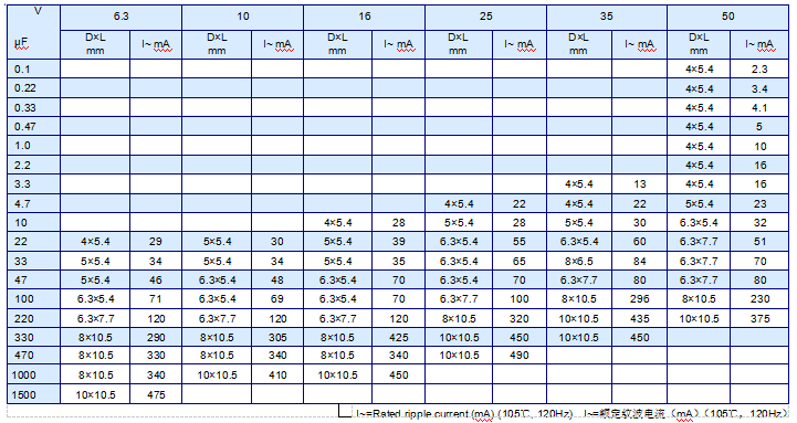 n 標稱電容量、額定電壓、額定紋波電流與外形尺寸對應表